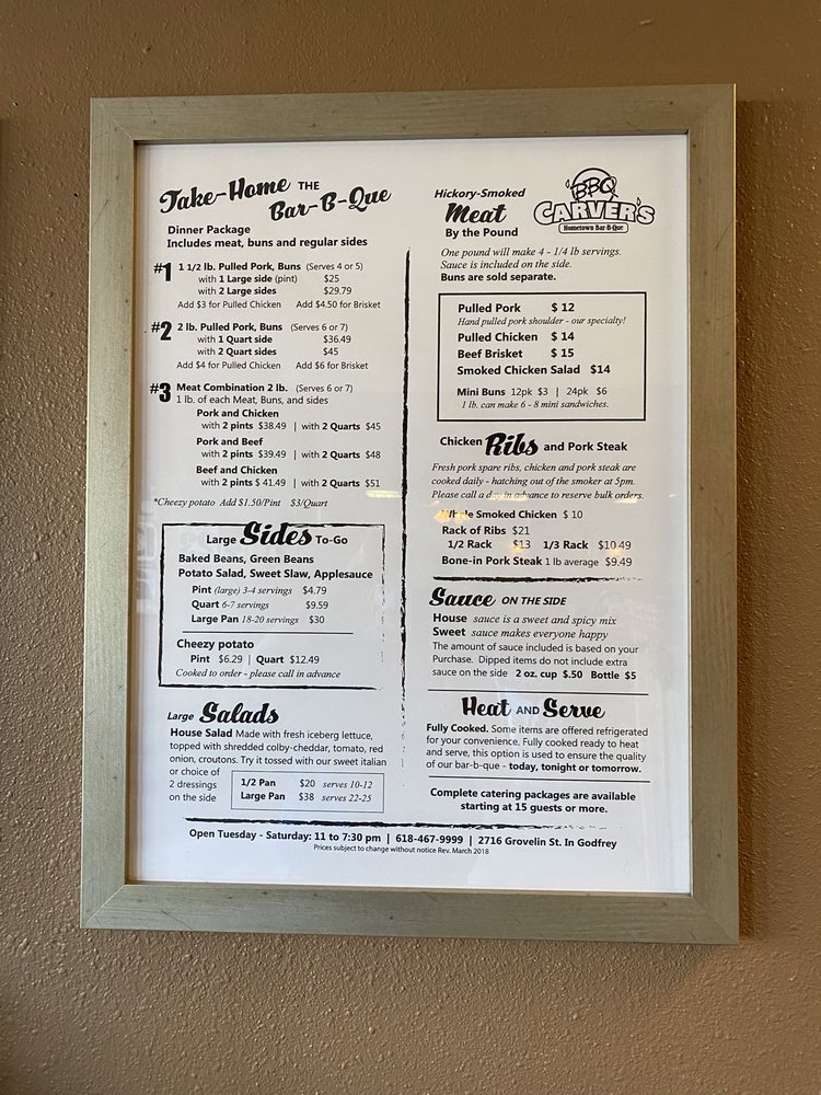 Welcome to Carver’s, a beloved BBQ treasure in Godfrey, Illinois. This family-run restaurant excels in delivering mouthwatering smoked meats and delectable sides, making it a favorite for locals and travelers alike. The menu showcases standout options like perfectly seasoned ribs and juicy rotisserie chicken, praised for their smokiness and rich flavors.